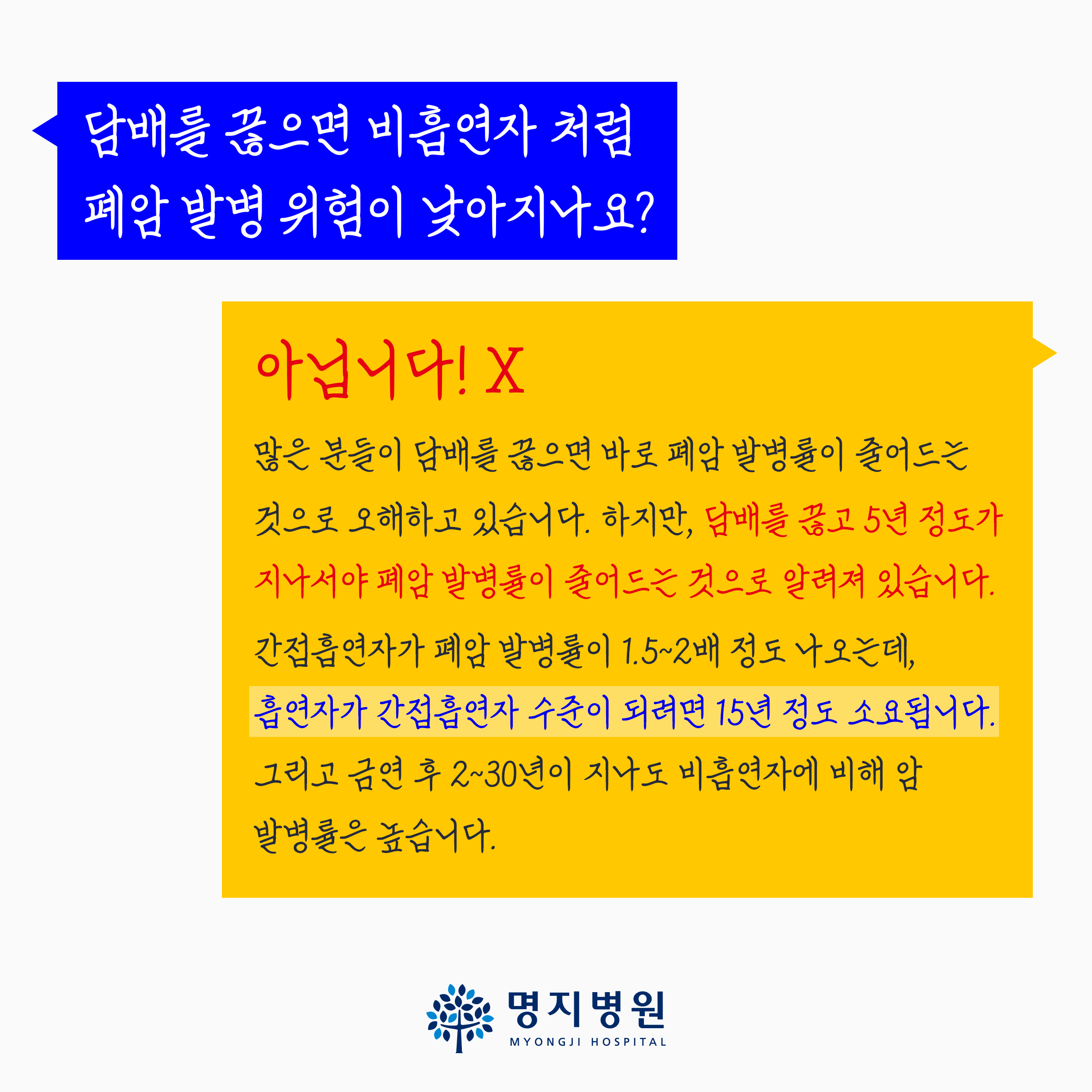 하지만, 담배를 끊고 5년 정도가 지나서야 폐암 발병률이 줄어드는 것으로 알려져 있습니다.