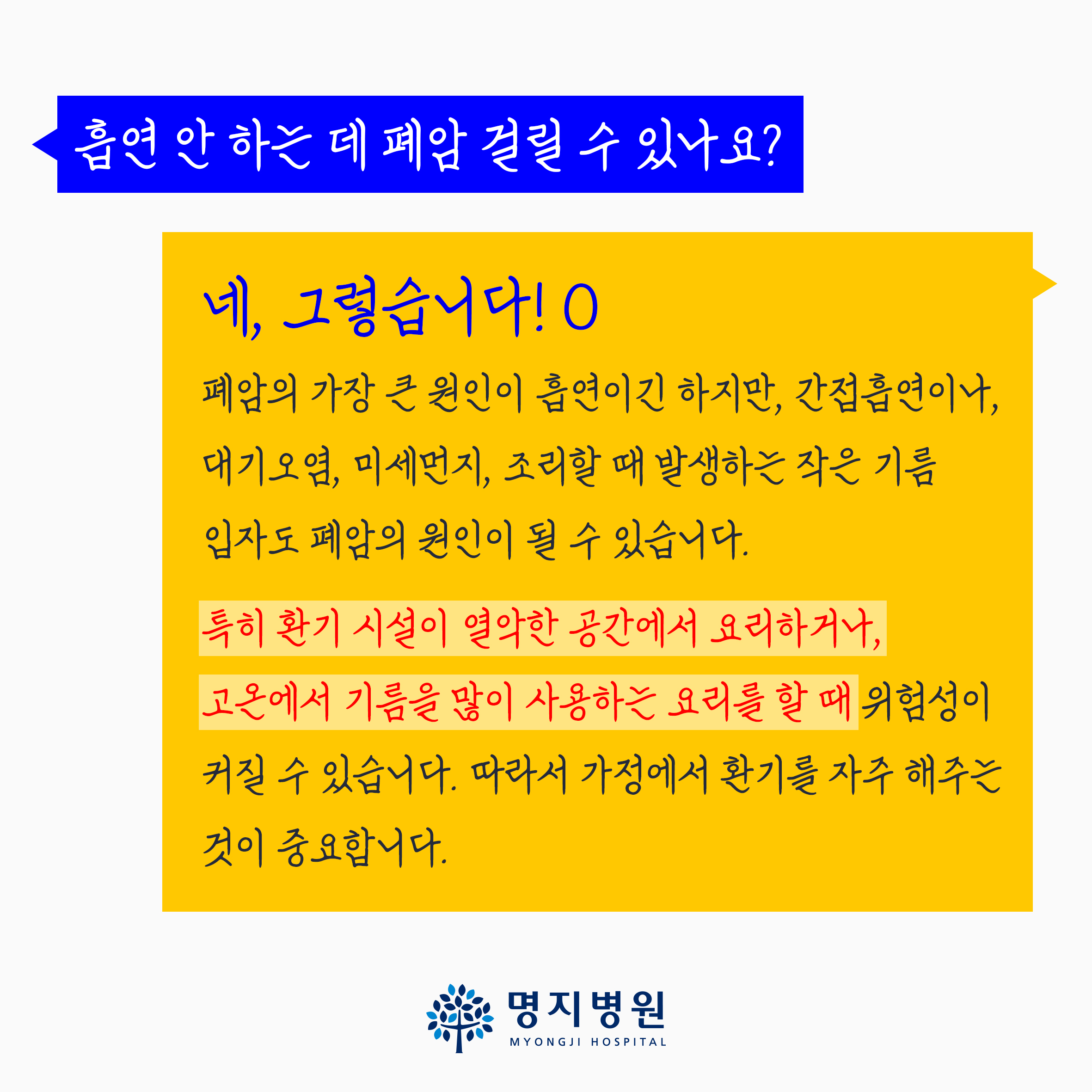 폐암의 가장 큰 원인이 흡연이긴 하지만, 간접흡연이나, 대기오염, 미세먼지, 조리할 때 발생하는 작은 기름 입자도 폐암의 원인이 될 수 있습니다.