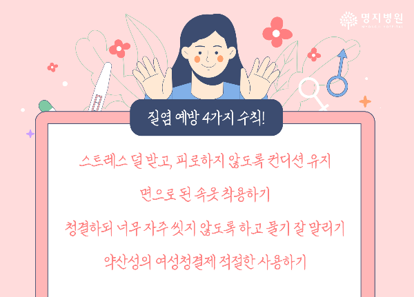 질염 예방을 위해서는 스트레스를 덜 받고, 피로하지 않도록 컨디션을 유지하는 것이 중요합니다. 혈액순환을 방해하는 꽉 끼는 속옷이나 옷은 피하고 되도록 면으로 된 속옷을 입는 것이 좋습니다. 질 주위는 청결하게 해야 하지만 너무 자주 씻지 않도록 하고 샤워 후에 물기를 잘 말려주는 습관이 필요합니다. 특히 질 내부의 산도가 약산성으로 유지되어야 하므로, 알칼리성 비누나 바디 샴푸보다는 약산성의 여성청결제를 사용하는 것이 좋습니다. 여성청결제도 너무 자주 사용하면 질 내 유익균까지 감소할 수 있기에 적절한 사용을 권장합니다.